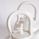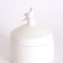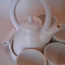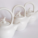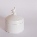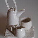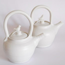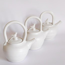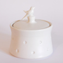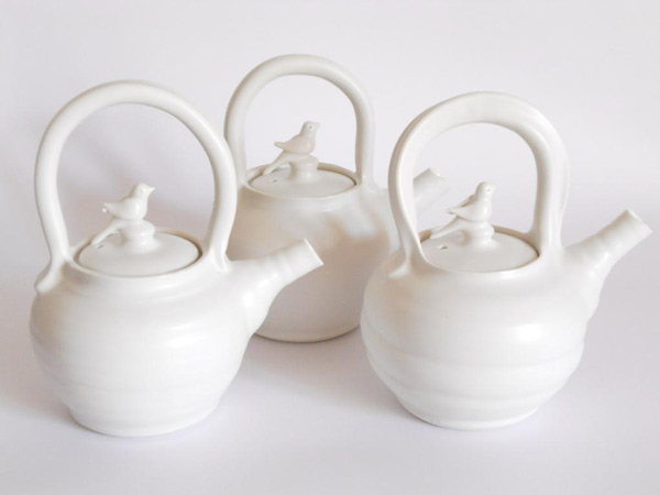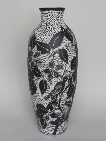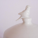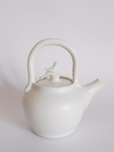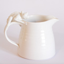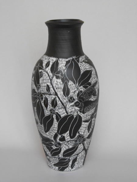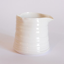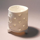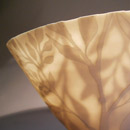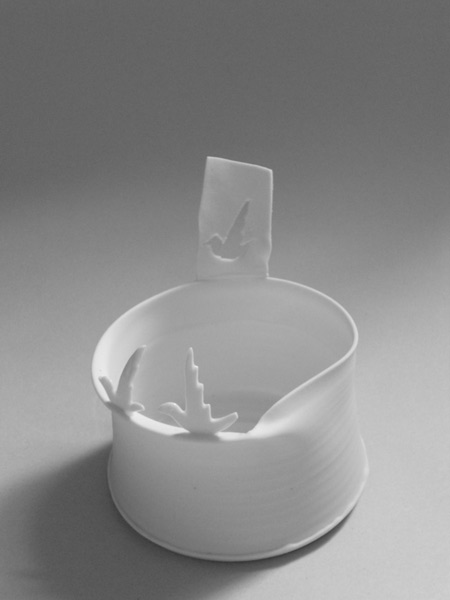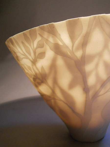 Thrown on the wheel, then decorated with cold wax when leather hard. Wash away the surrounding clay to create the relief decoration, and high fired. This technique creates very fine porcelain, that holds light and forms shadows on the surface of the pot.
